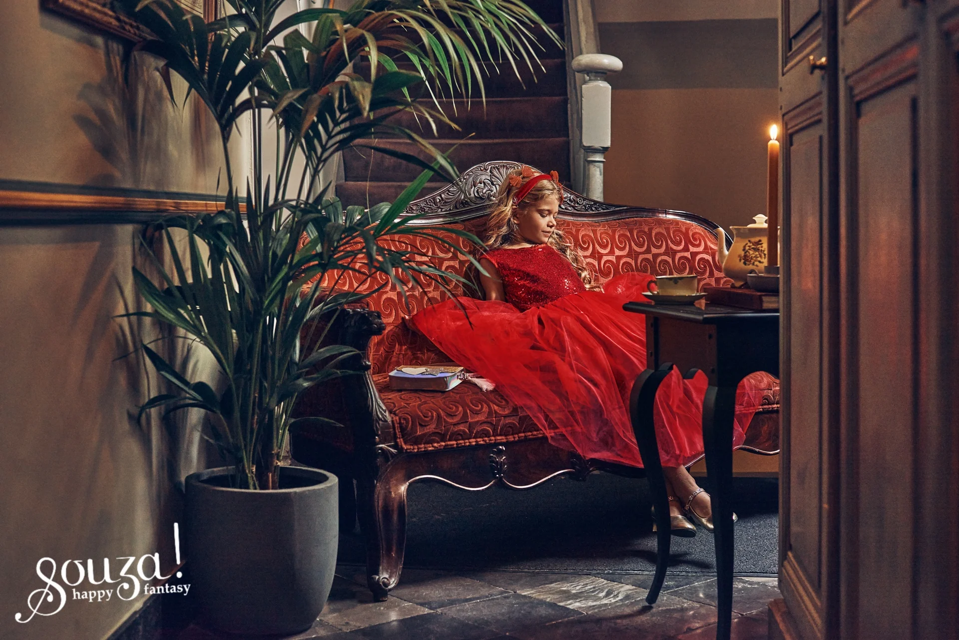 What a gorgeous red dress…everyone at the party gazes amazed at the beautiful princess… The front part of the top is made of fabric full of small red glitter sequince, the back side of stretch velour fabric.